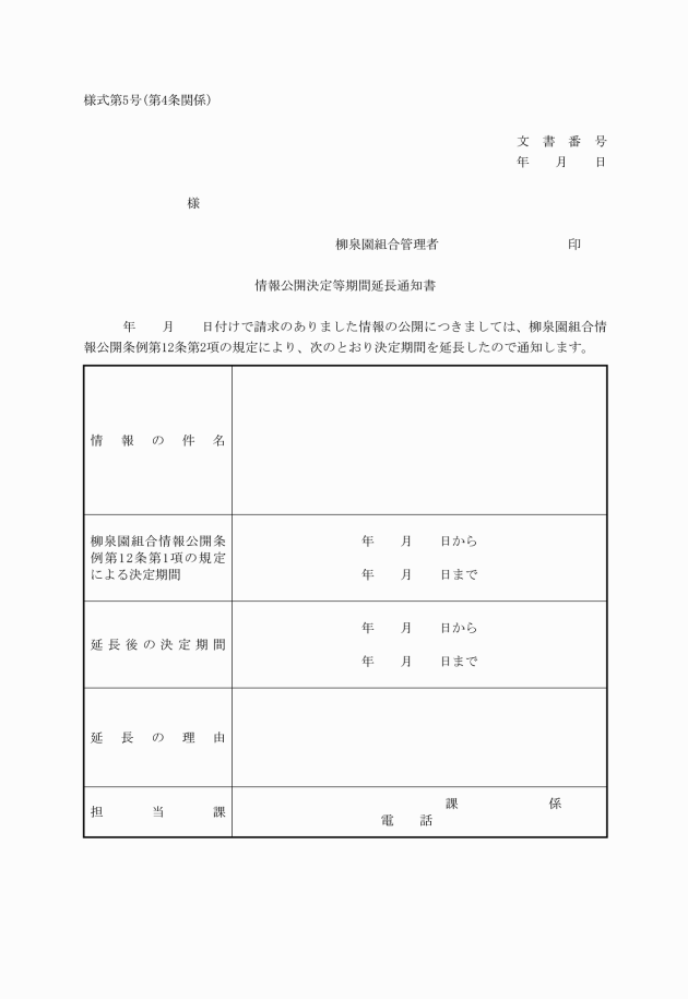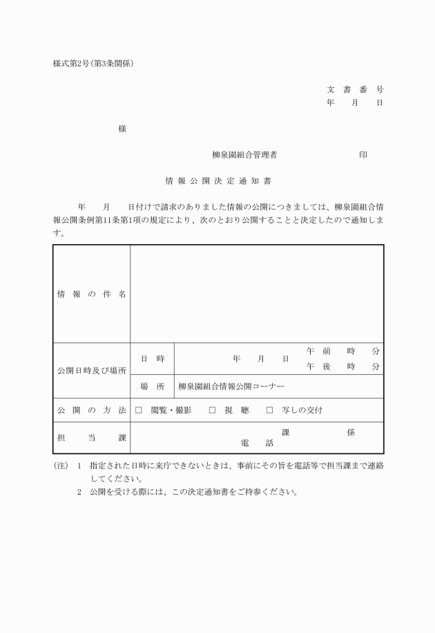 第11条 条例第33条に規定する実施状況の公表は、年度ごとの公開請求の状況、公開又は非公開の決定の状況その他の事項について、柳泉園組合が発行する広報誌等に掲載する方法により行うものとする。