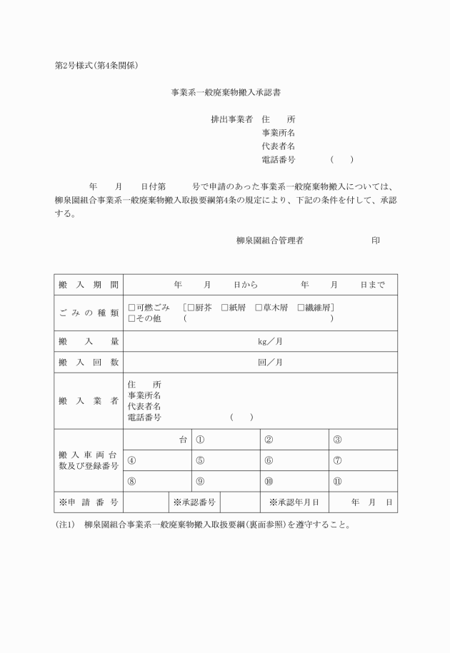 第3条 排出事業者は、搬入に際してあらかじめ柳泉園組合管理者(以下「管理者」という。)に「事業系一般廃棄物搬入申請書」(第1号様式。以下「申請書」という。)を提出しなければならない。この場合において、申請書の記載内容については、排出事業者が責任を負うものとする。